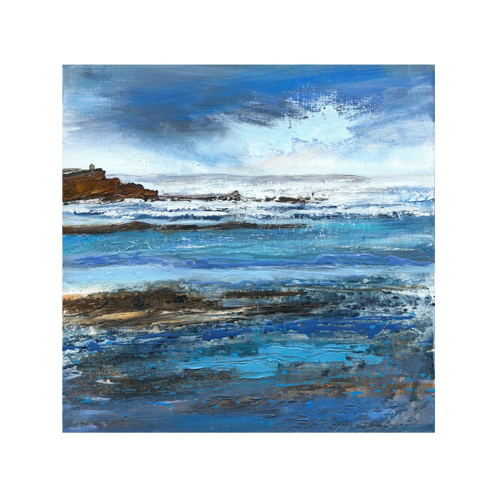 Wild surf out in the bay which is pounding the breakwater. The iconic barrel is just visible at the end. Strong contrast and a hundred different blues fill the painting with vitality and energy typical of our lovely North Cornwall